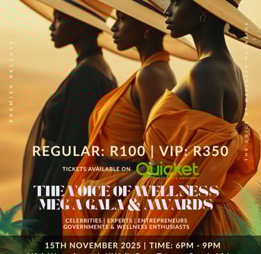 Be part of the biggest wellness celebration in Africa! Join thought leaders, changemakers, and conscious brands at the Voice of Wellness Mega Gala & Awards 2025. Enjoy soulful conversations, powerful connections, and transformational moments.
