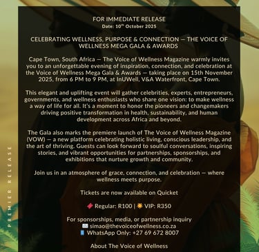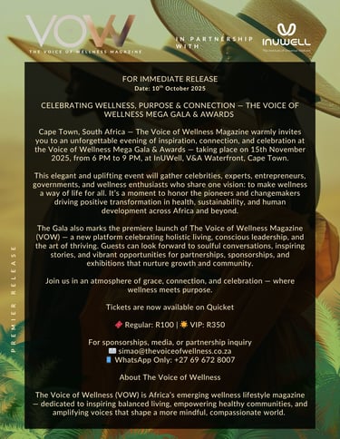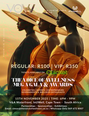 Cape Town is about to witness an unforgettable evening where wellness meets elegance, purpose meets passion, and community meets celebration. On 15th November 2025, from 6 PM to 9 PM, the Voice of Wellness Magazine (VOW) will host the Wellness Mega Gala & Awards at InUWell, V&A Waterfront, Cape Town — a grand evening that redefines how Africa celebrates wellness, sustainability, and conscious living.An Evening of Inspiration, Connection, and Celebration