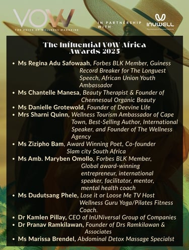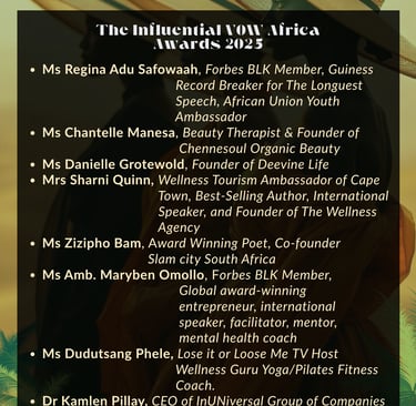The central emblem, “The Influential VOW Africa Awards 2025,” highlights a continent rising through mindful leadership and conscious living. In partnership with InUWell, the Institute of Universal Wellness, the awards stand as a beacon for collaboration, celebration, and the advancement of holistic wellness in Africa and beyond.